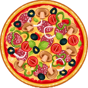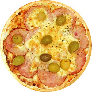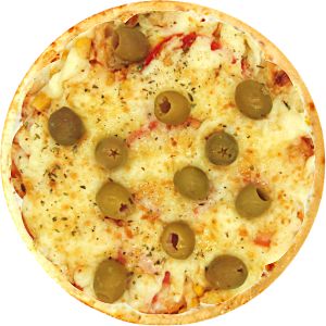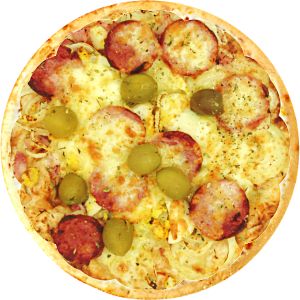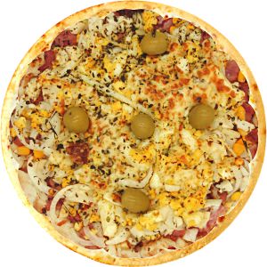 Azeitonas, Calabresa, Cebola, Ervilha, Milho, Molho de tomate , Muçarela, Orégano, Ovo, Palmito, Presunto