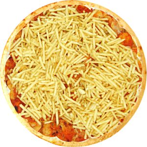 Batata palha, Molho de tomate , Muçarela, Orégano, Strogonoff de frango