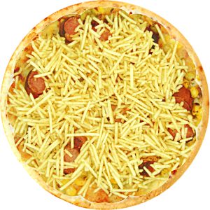 Batata palha, Ervilha, Milho, Molho de tomate , Muçarela, Orégano, Salsicha