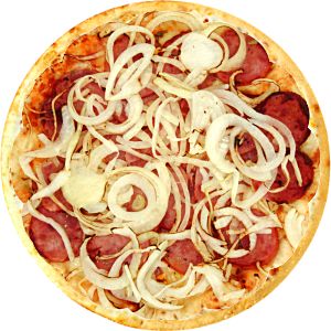 Cebola, Linguiça blumenau, Molho de tomate , Muçarela, Orégano, Tomate
