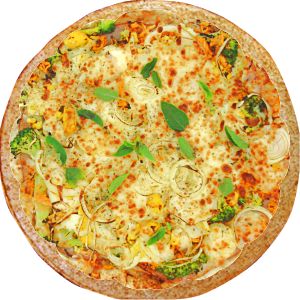 Brócolis, Cebola, Champignon, Frango desfiado, Manjericão, Molho DNA, Muçarela de búfala, Orégano, Ovo, Peito de peru