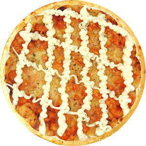 Bacon, Cebola Crispy, Cheddar, Frango desfiado, Molho de tomate , Muçarela, Orégano