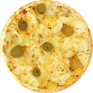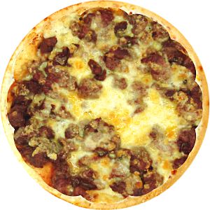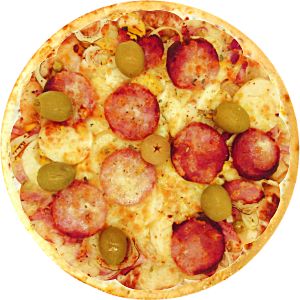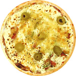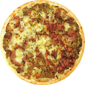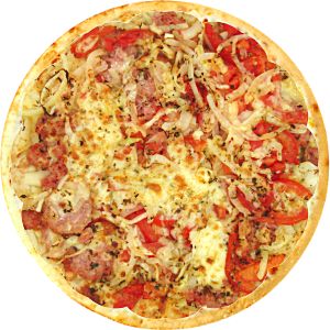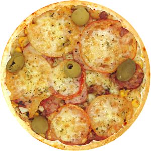 Azeitonas, Bacon, Calabresa, Milho, Molho de tomate , Muçarela, Orégano, Palmito, Tomate