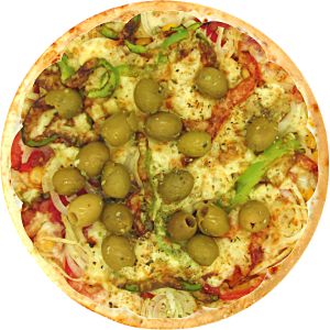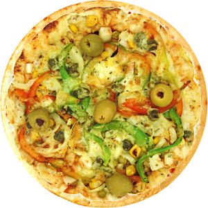 Alcaparras, Azeitonas, Cebola, Ervilha, Milho, Molho de tomate , Muçarela, Orégano, Palmito, Pimentão
