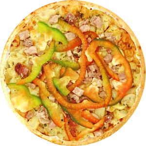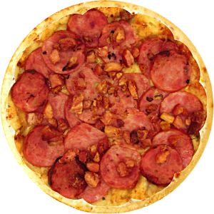 Bacon, Calabresa, Manjericão, Molho de tomate , Muçarela, Orégano, Pimenta, Pimentão, Tomate