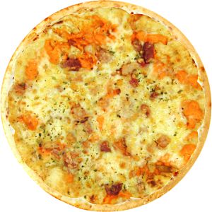 Bacon, Cream cheese, Frango desfiado, Milho, Molho de tomate , Muçarela, Orégano